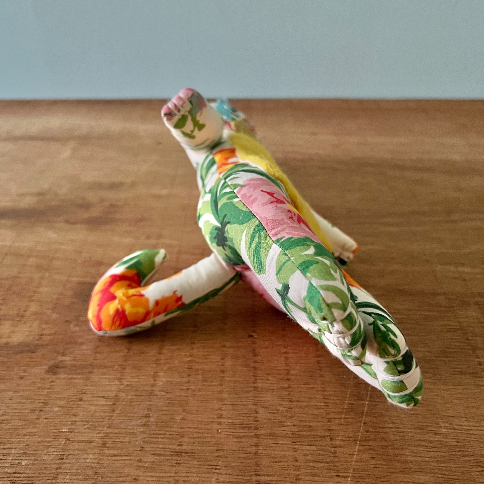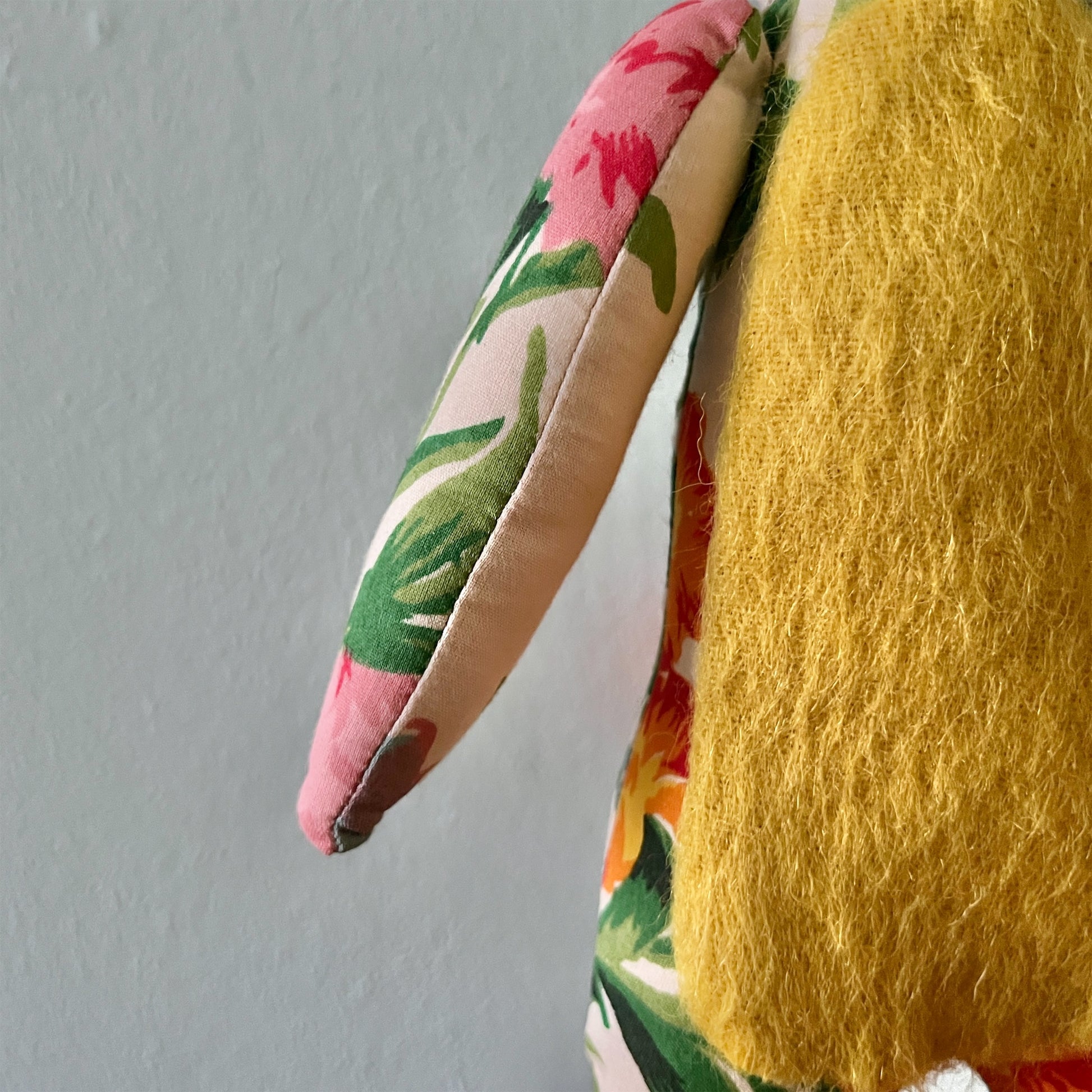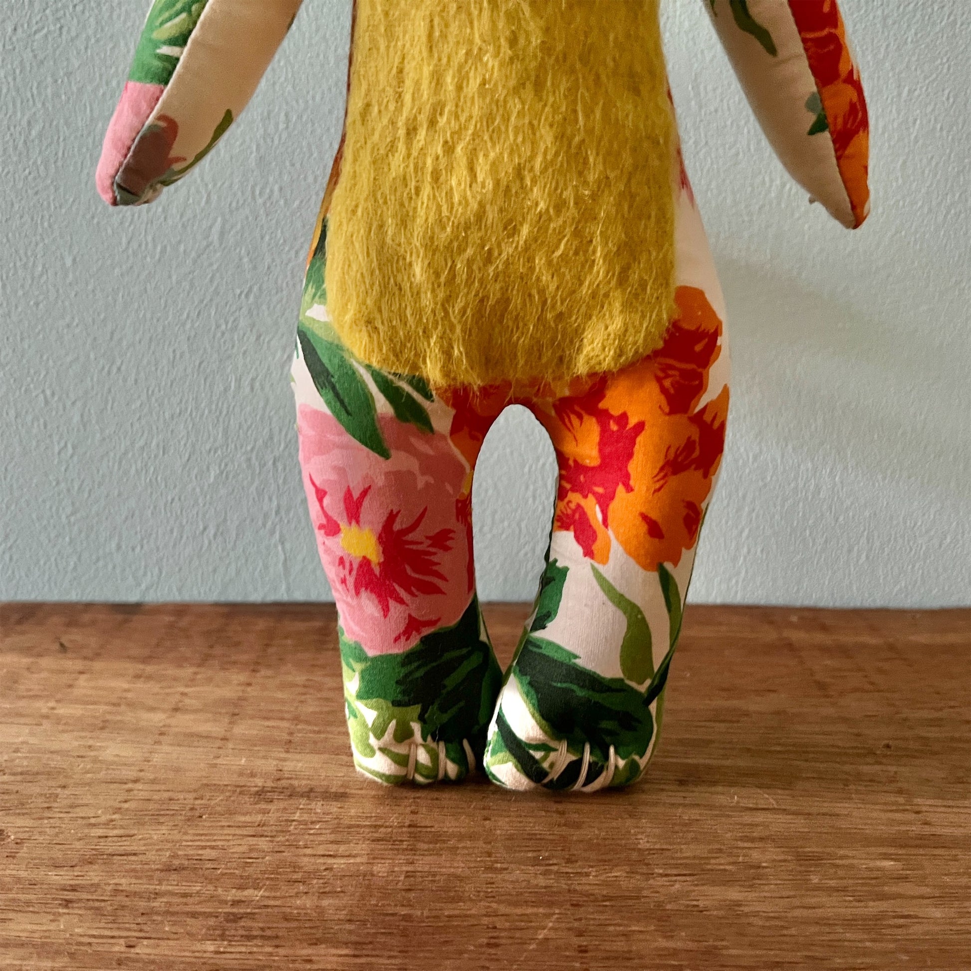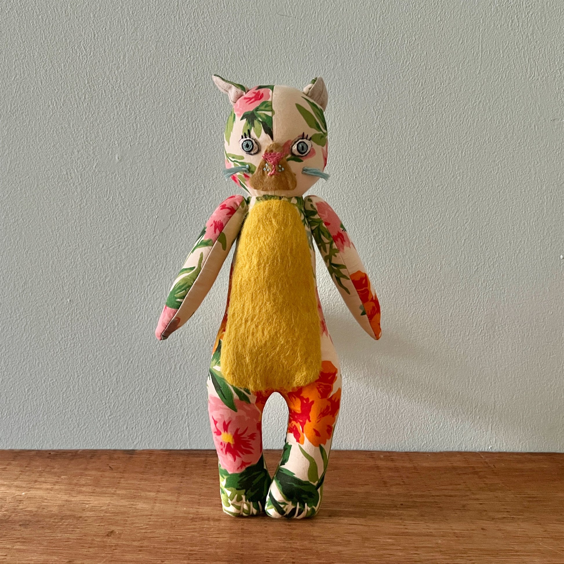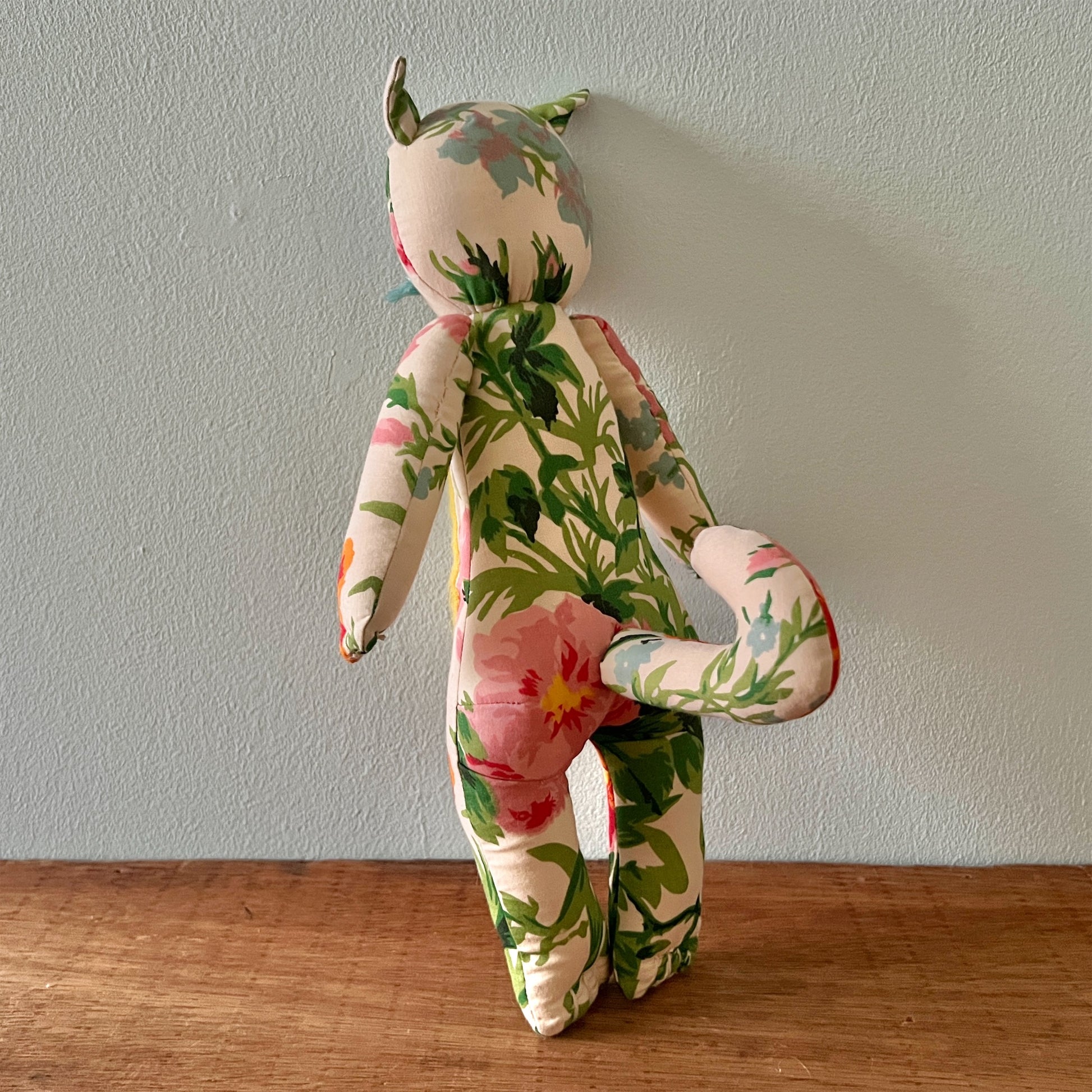 全て一点ものです。ヴィンテージの布地なども用いています。布地の組み合わせを考え、ぬいぐるみのボディを製作後、一つ一つ刺繍糸の配色にこだわって製作しております。