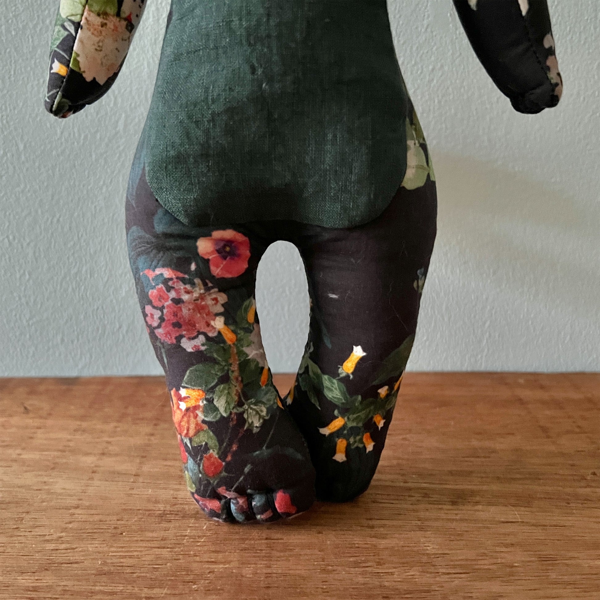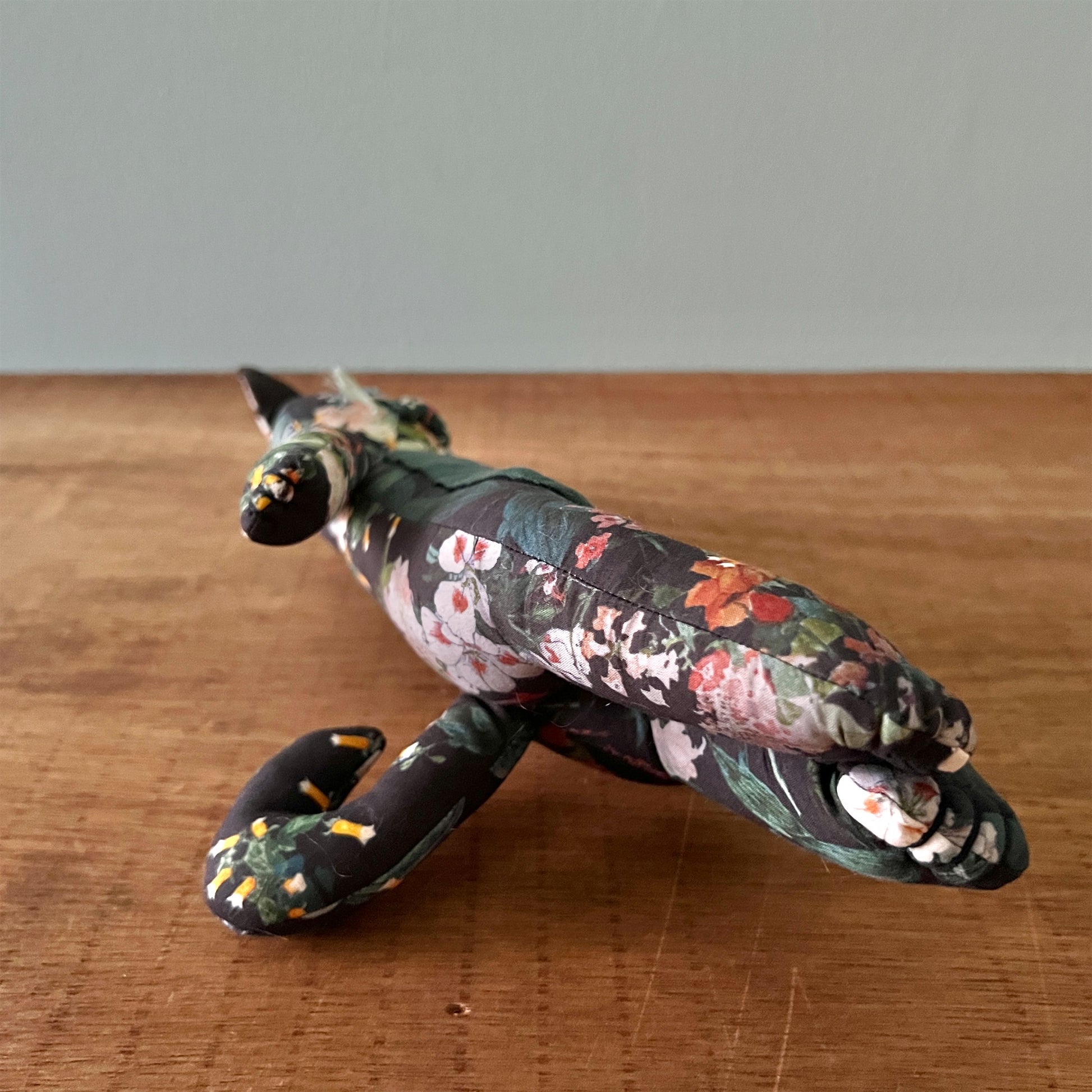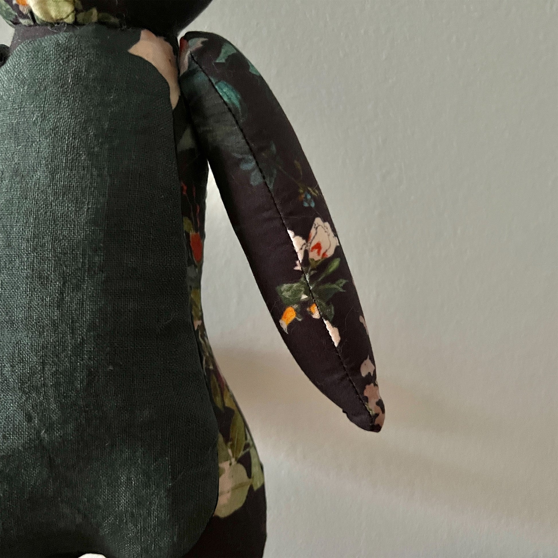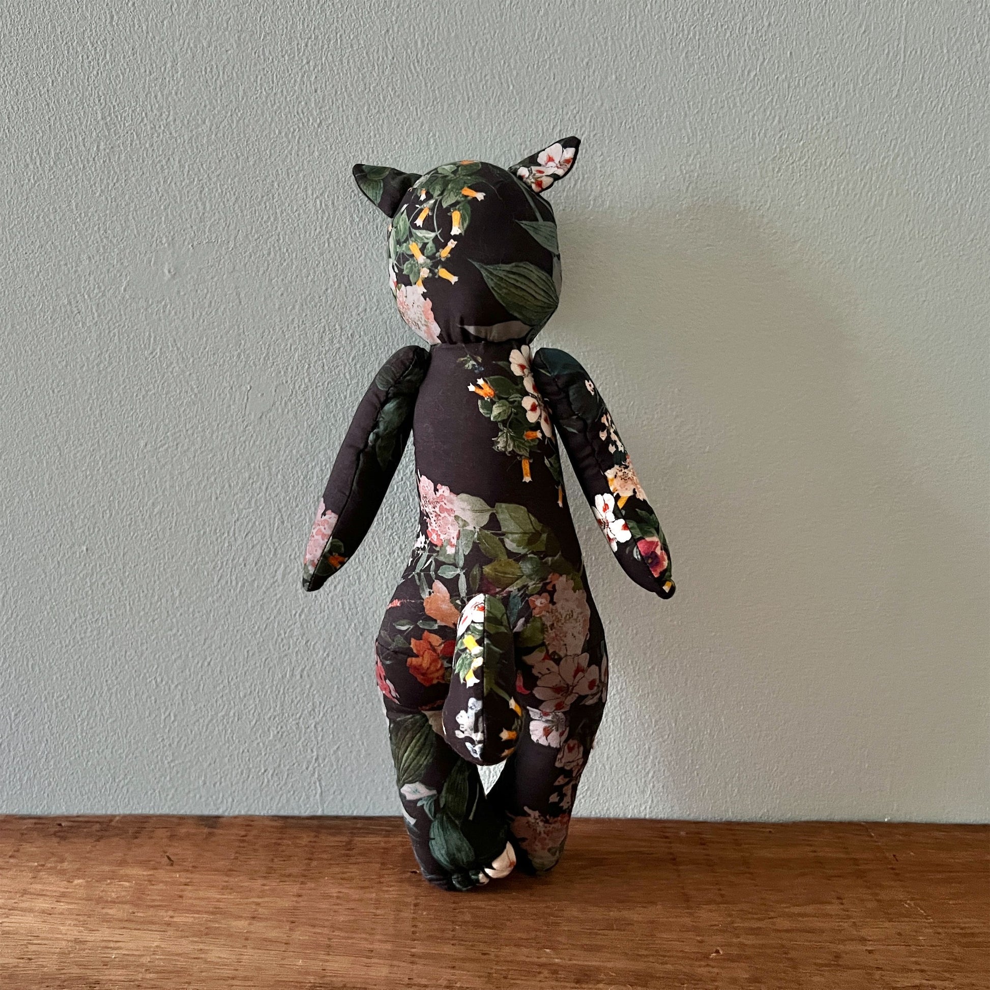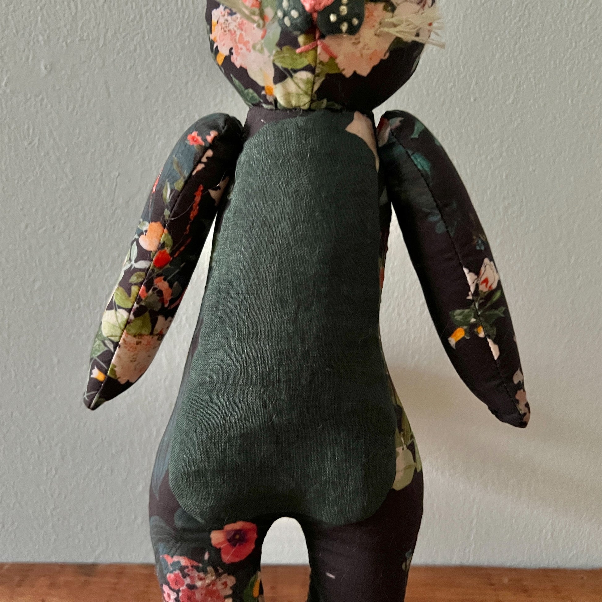 全て一点ものです。ヴィンテージの布地なども用いています。布地の組み合わせを考え、ぬいぐるみのボディを製作後、一つ一つ刺繍糸の配色にこだわって製作しております。