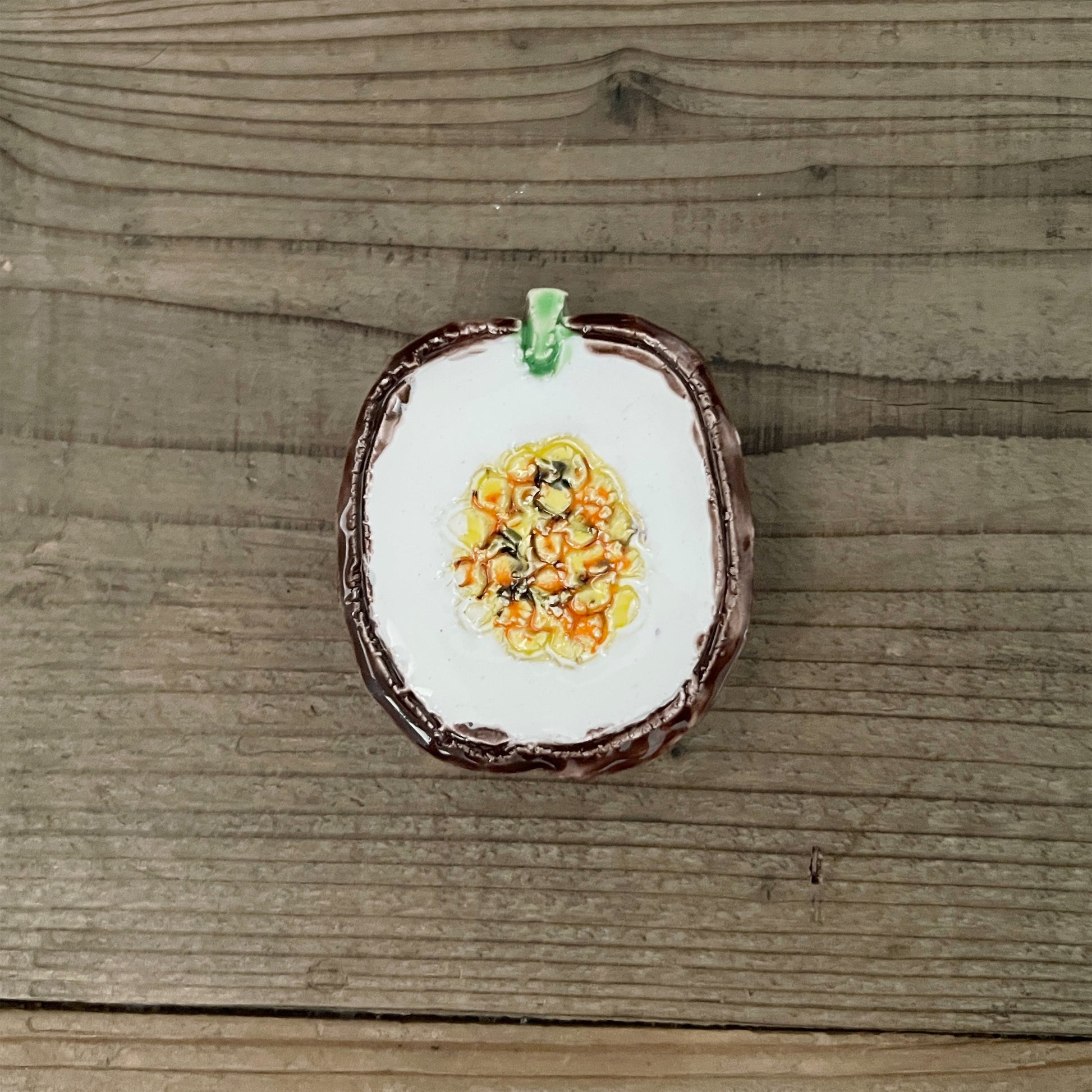 野菜やフルーツ、動物などを模したセラミック製のオブジェ。鮮やかな色づかいと、釉薬の光沢感、厚みのあるフォルムが特徴的。壁に掛けたりテーブルデコレーションとして、暮らしに彩りを添えてくれるチャーミングなオブジェです。MV% Ceramics Designイタリア・ミラノを拠点とするハンドメイドセラミックブランドで、建築家・デザイナーのマリアヴェラ・キアリによって2002年に設立されました。彼女の作品は、自然や日常から着想を得た遊び心あるモチーフと鮮やかな色彩が魅力です。製品はすべてミラノのアトリエで手作業によって作られています。※ハンドメイドのため個体差があり、掲載の写真と異なります。お選びいただけませんのでご了承ください。※釉薬や色合い、向きなどが異なる場合があります。※陶器の為、落とすと割れたり欠けたりしますのでご注意ください。