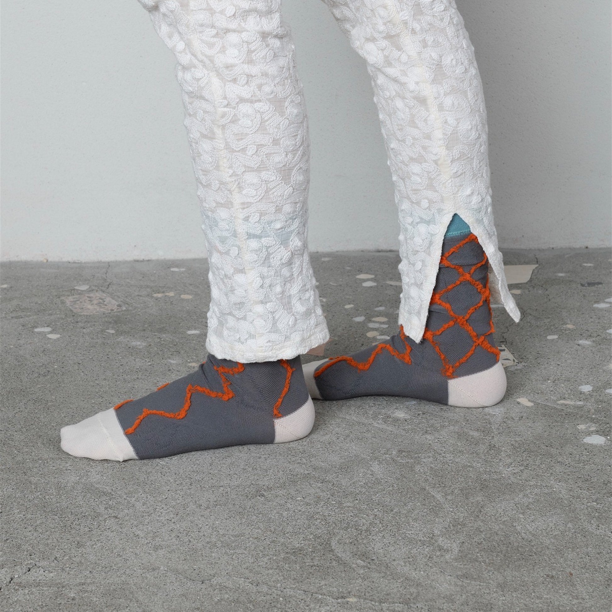 もこもこ糸のダイヤ柄がかわいいデザインソックス。伸縮性のある糸で編まれており、23-26cmと幅広い方に履いていただけます。【TRICOTE】ニット生地を素材とした商品を展開するライフスタイルブランドこちらの商品は実店舗でも取り扱っております。オンラインショップ上でご注文いただいても、現品が実店舗にて「売約済」となっておりご希望に添えない場合もございます。その際はメールにてご連絡いたしますので、予めご了承ください。