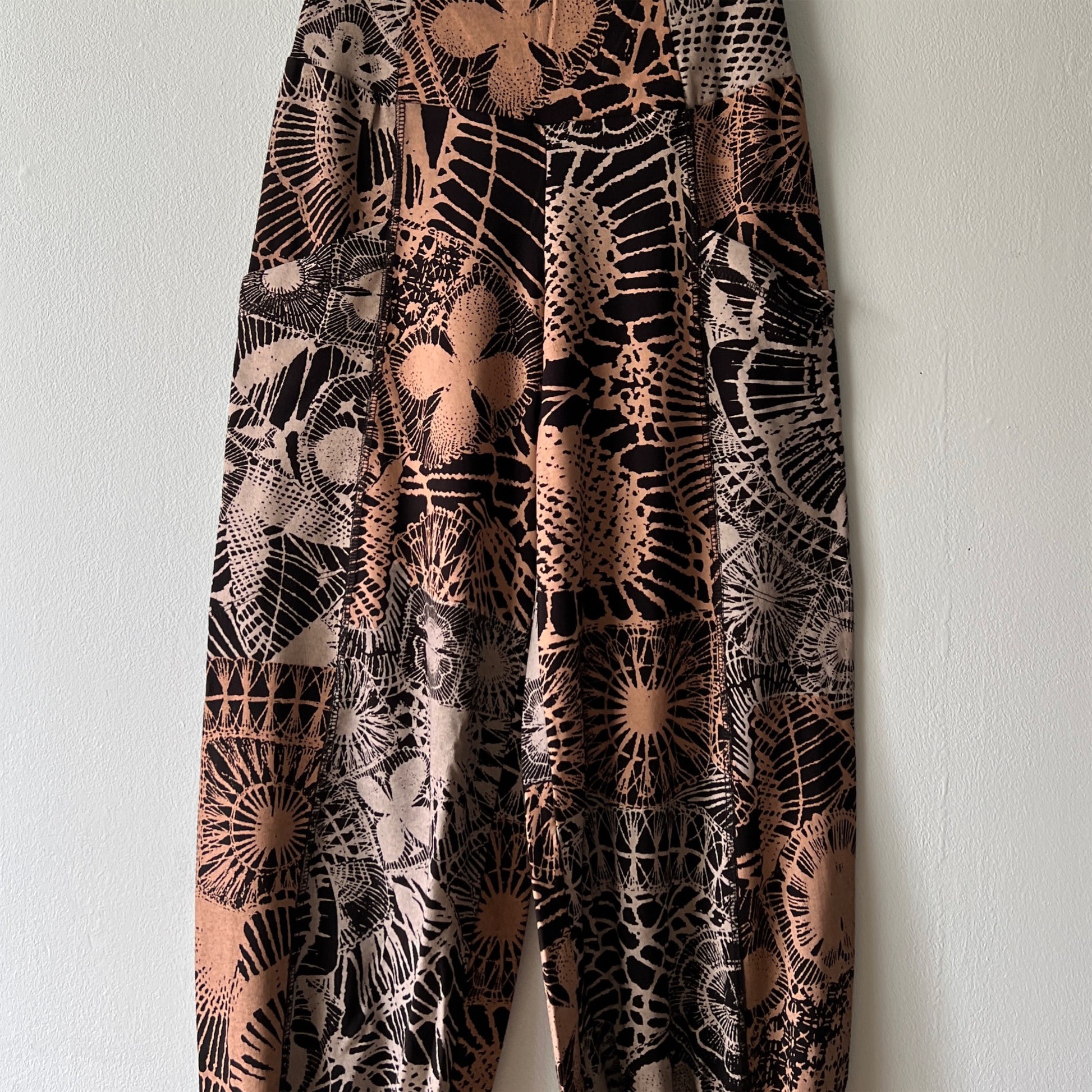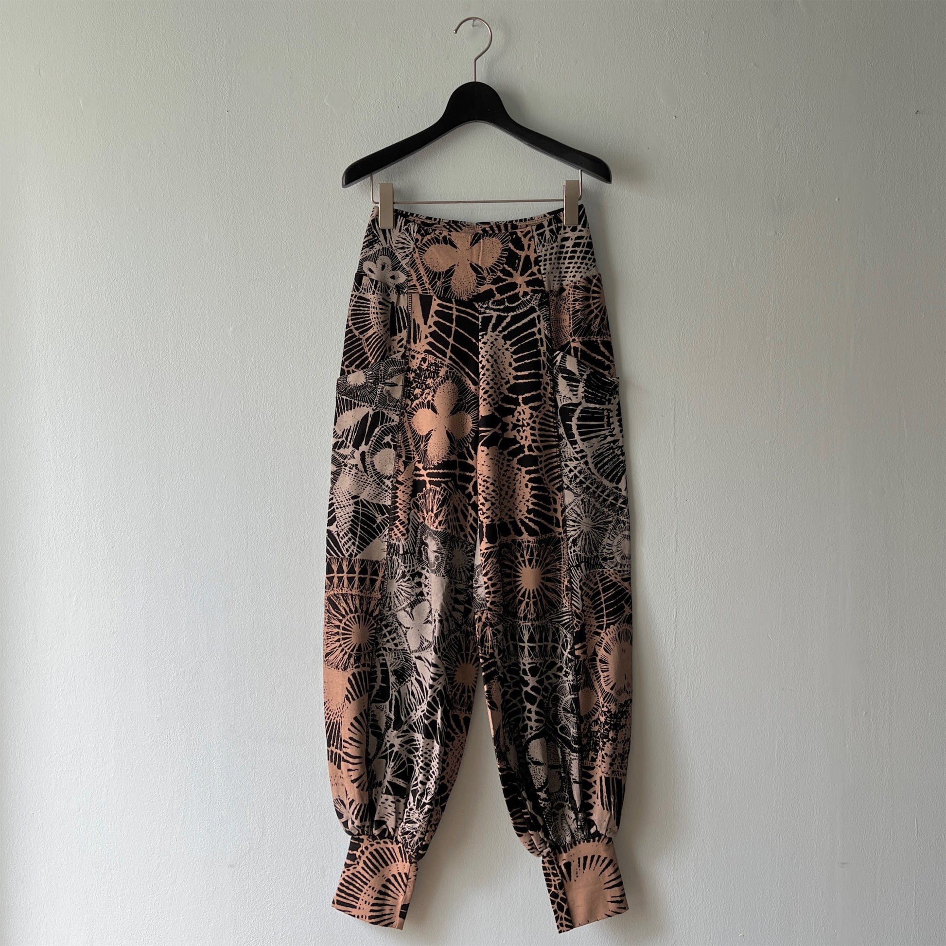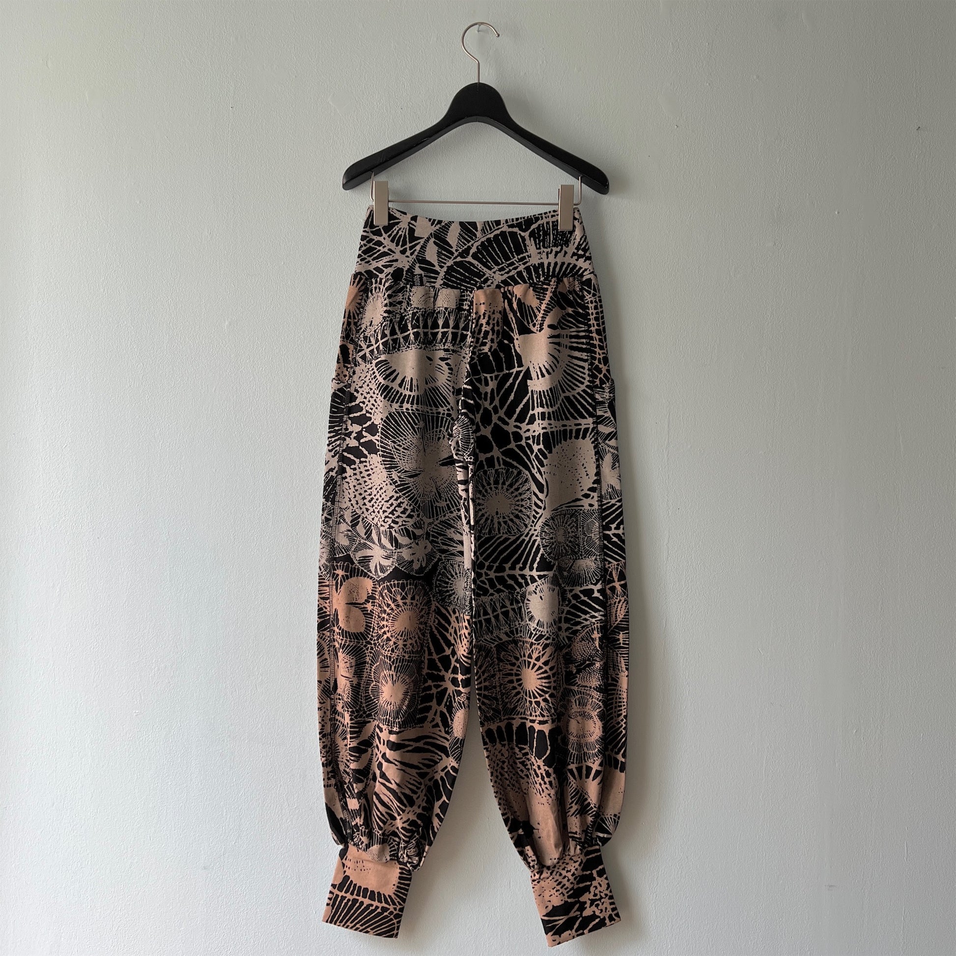 切り替えのポケットがついたアラジンパンツ。【Juana de Arco】アルゼンチン発のライフスタイルブランド。カラフルで1点もののウェアやランジェリー、インテリアを展開している。アルゼンチン・ブエノスアイレス生まれのJuana de Arco(ホォアナデアルコ)。1998年設立。ポジティブでのびのびとした色使いと唯一無二のテキスタイルが特徴。カラフル&ハートフルな1点もののランジェリー、ヨガウェア、リラックスウェアといったレディースラインの他にメンズ、インテリア、キッズラインまで充実したラインナップで展開。愛情溢れる心豊かな生活を提案するライフスタイルブランド。●お洗濯に関して1点ずつハンドメイドで作られた製品です。最初のお洗濯は色落ちにご注意くださいませ。優しく手洗いもしくは洗濯機のおしゃれ着洗いモードでお洗濯推奨です。長年愛用しておりますがオーナーはネットに入れておしゃれ着洗いで長持ちしています。モダール生地は水濡れすると重たくなるので乾かす際にワンピースやパンツなどの生地分量が多いものはそのままハンギングして干すとだんだん生地が伸びてきます。干す際に重さを分散させるように干すのがおすすめです。(平置きまでいかずともハンガー二本にわたしてかけるなど)水濡れしたまま放置は色移りの可能性がございますのでご遠慮ください。こちらの商品は実店舗でも取り扱っております。オンラインショップ上でご注文いただいても、現品が実店舗にて「売約済」となっておりご希望に添えない場合もございます。その際はメールにてご連絡いたしますので、予めご了承ください。