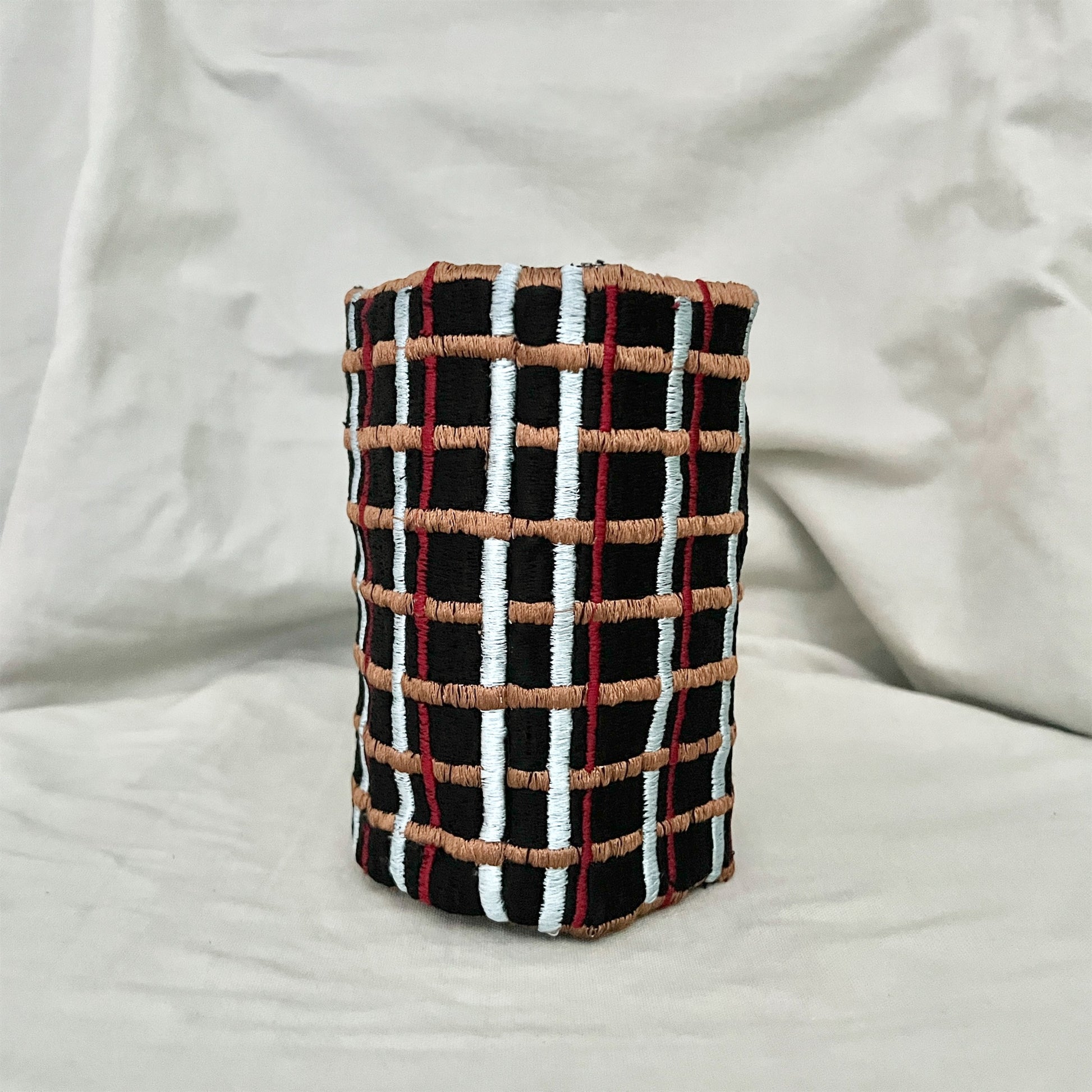 横振り刺繍によってひと針ひと針埋めていく生地は平面から立体へ刺繍による空間演出をします。