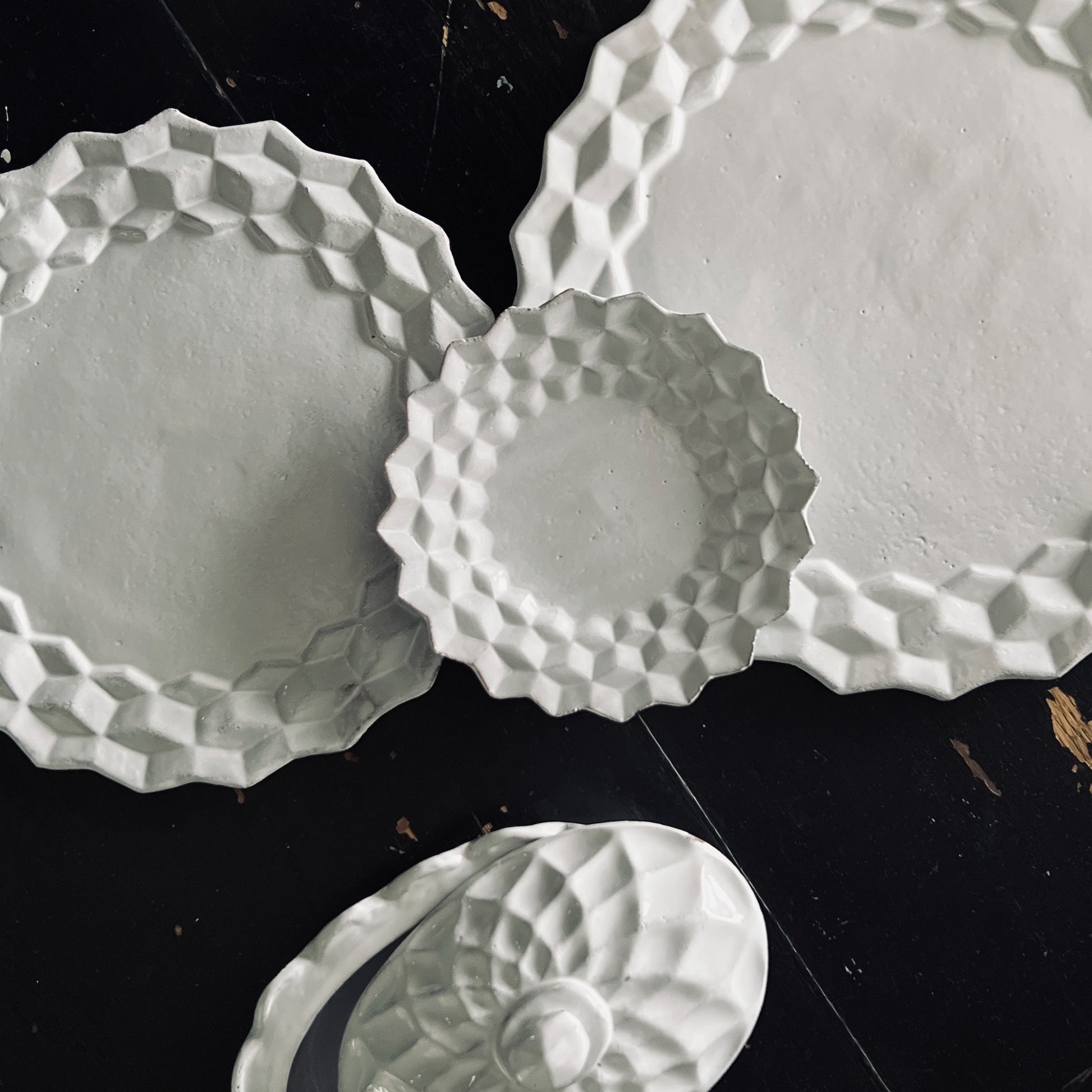 パリ郊外の黒い土に、真っ白な釉薬をかけたアスティエ・ド・ヴィラットの陶器は、熟練の職人たちがパリ市内のアトリエで制作する“Made in Paris”の器です。19世紀の伝統的な器に着想を得て、ボザール美術学校で学んだ彫刻技術にひねりを加えながら創り出す器は、料理や絵画を惹き立てるキャンバスのように、凛とした存在感を放っています。
