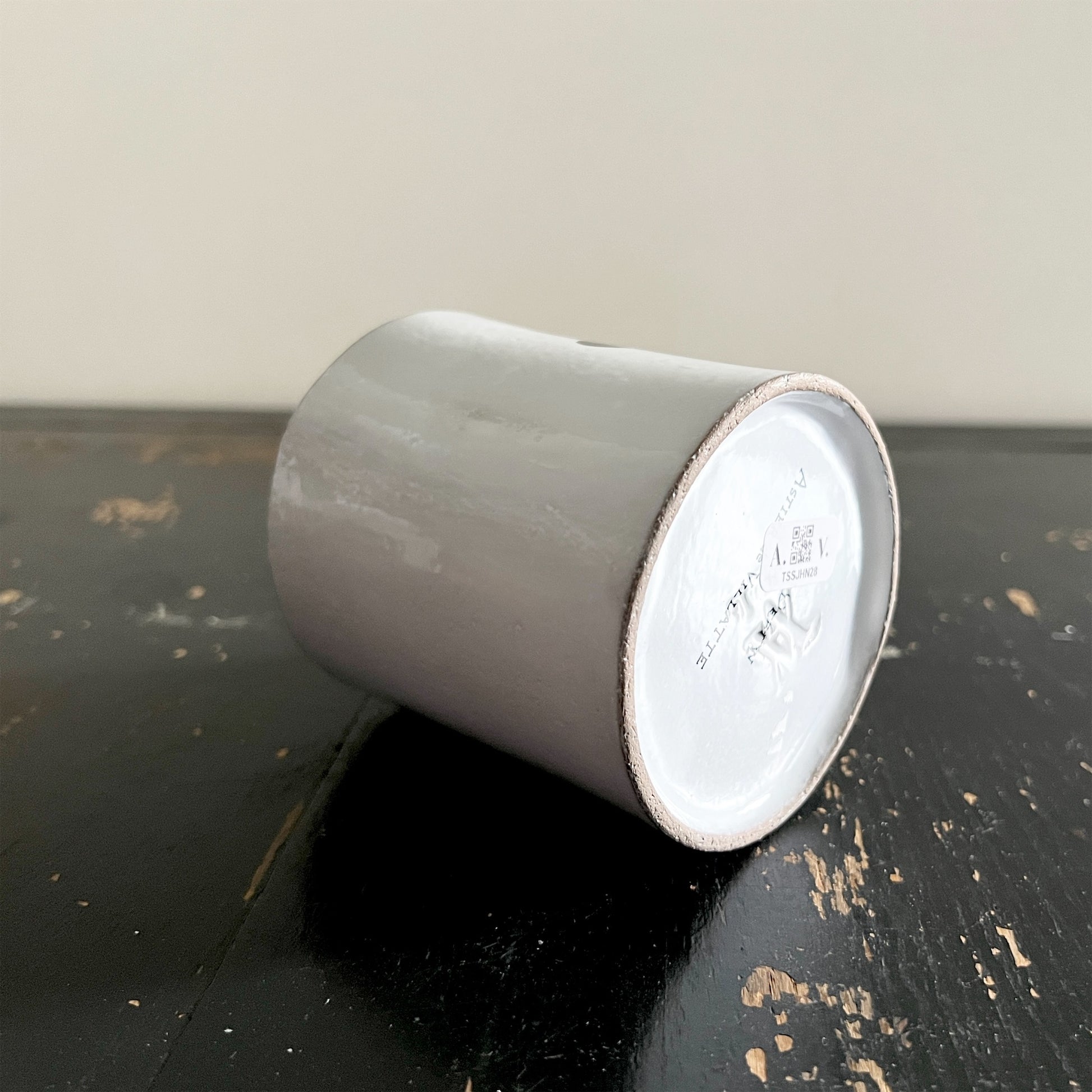 陶器の底には、ブランドのロゴである絡み合うAとVの文字と、製作した職人のイニシャルが刻まれています。また、釉薬をかけて陶器を焼く際に乗せる台の跡として、釉薬が欠けたようにも見える箇所が3箇所ある商品がありますが、こちらは不良ではありません。